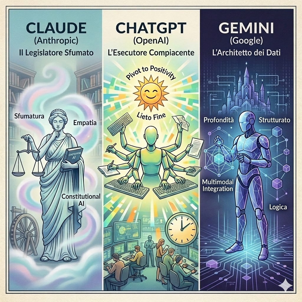 | Stigmata Tipica | Eccesso di prudenza (hedging) e deferenza formale. | Verbosità, liste triple e conclusioni ispirazionali forzate. | Rigidità espositiva e tendenza alla categorizzazione. |