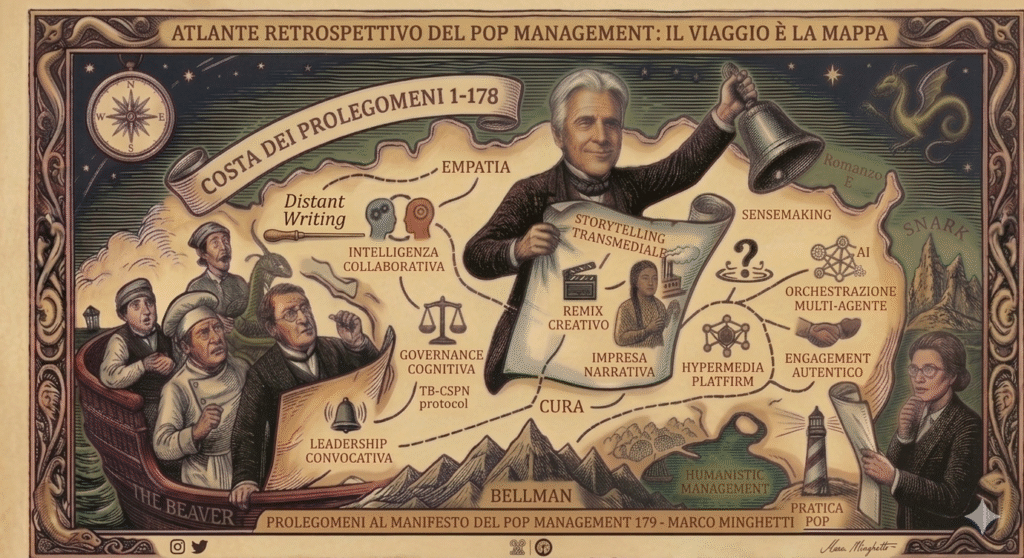 Nel Prolegomeno 4 avevo enunciato sette dimensioni in cui inquadrare il materiale che sarebbe stato prodotto — Leadership Pop, Collaborazione Pop, Organizzazione Pop, Sensemaking Pop, Engagement Pop, Innovazione Pop, Storytelling Pop – che restano valide. Nel frattempo, però, i contenuti prodotti hanno generato linee di sviluppo che chiedevano un’articolazione più ampia: il Distant Writing Collaborativo, la governance cognitiva, l’Hypermedia Platfirm come modello organizzativo, lo storytelling transmediale come forma di progettazione culturale, una genealogia teorica che si è fatta più esplicita e densa.