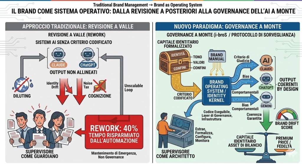 Si tratta di risolvere un problema di struttura: spostare la supervisione da funzione umana a infrastruttura tecnologica, codificando il criterio — identità, tono, valori, confini — in un sistema operativo che governa l’AI prima ancora che generi output.